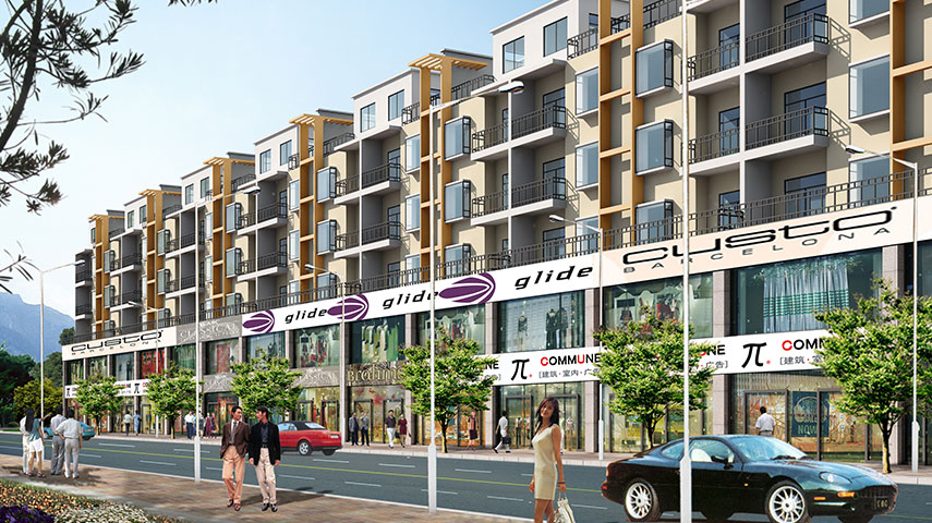 规模沿厦门路(小区西面)、建设路(小区南面)临街布置商务住宅区,在考虑经济和景观的基础上布置为一连排的底商住宅(5+1F),建筑色彩时快、同周边城市环境及城市构造结合密切。利用二层套空空商花园设计,即解决了底层商业氛围营造之需,又为行为提供了人性化的遮阳避雨棚;同时,空中花园又为街道增添了一条数百米长的空中绿化走廊,丰富了城市景观,为商业环境注入优雅的元素;底层商铺采用10㎜厚大幅落地玻璃,深灰色时尚的落地玻璃门;由专业商业经营机构介入的规范管理,一个高尚繁华的商业格局就此形成,升值空间成为“无限可能”.....
