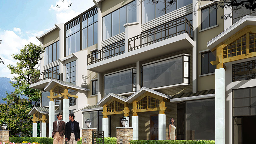 “嘉龙花园”项目在小区中心水景处匠心独韵的规划了四栋单体Villa,坐落在由水景庭院、木制小品、喷泉雕塑、鹅卵石小径、各类名贵植物围合而成的自然环境之中,设计时追求更加自由舒适的空间关系,不对称设计、外廊设计、亲水绿廊、前庭后院,强调自然景观、空气阳光、运动流水。规划设计为新古典主义(Neoclassical)建筑风格,外观装饰豪华,立面为一排双层柱廊,气度尊贵;墙面、窗户、窗顶、屋檐等处均有精美的雕花装饰,尽显豪华气派;冬日处两根厚实的古典圆柱所支撑的高挑门廊,启示着主人卓尔不凡的身价和豁达宽广的心胸。材质和色彩选用浅灰色毛面花岗石为基座,英红色、白色高档外墙涂料为墙身,屋顶则是作为别墅专用的铁灰色饰面瓦,整栋别墅流露出着自然而高贵的色彩。