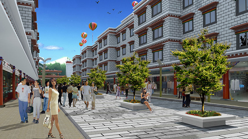 作为“嘉龙花园”开发项目中最具特色的子项目,为打造一条富有藏民族神韵的、展现原生态魅力的步行街,规划设计采用大量藏式民居的建筑符号,在建筑材料的使用上,全部选用西藏当地材料,以现代建筑语言加以诠释。经反复论证,确定步行街入口由一组体量雄伟、彩饰华丽、造型质朴的藏式牌坊、碉楼组成,充分体现藏民族悠久的历史、灿烂的文化、精美的工艺;街道两侧商铺、住宅(4+1 F)完全采用藏民族的传统手法装饰;步行街路面、行人休息座椅材质以花岗石为主,以绿色植物、花坛等为其色彩缀饰,色调组合内敛然张力十足;所有街景小品、灯饰、Parking等均着力表现藏民族的日常生活片段,竭力将藏民族最纯粹的民风、民俗一一展现,创造出具有历史文化传承、鲜明时代特点的民族风俗街。