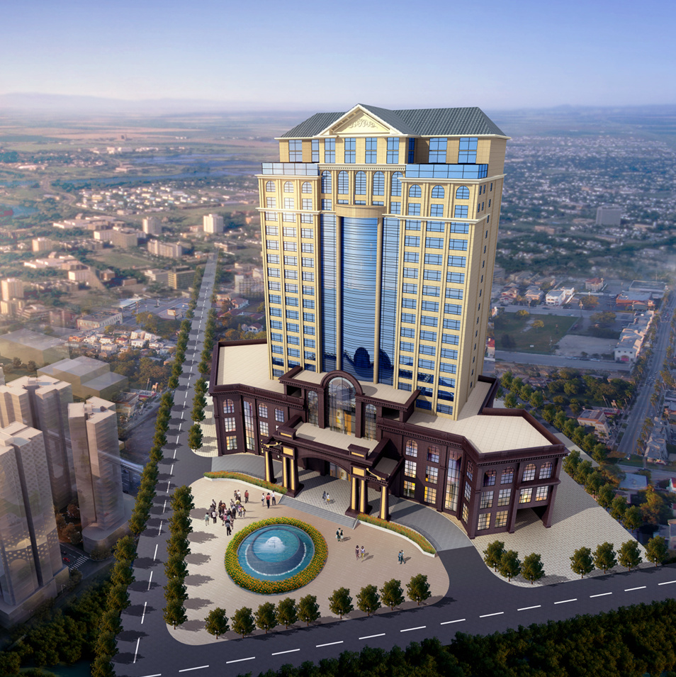 在厦门路和建设路的交汇处,规划布置了一栋高端的综合商业大厦以汇聚商业所需之人气。大厦空间有13.5米高的入口大堂及9米高的休息大厅组成,充分体现出豪华、气派、舒适。大厦的景观轴线面对小区中央水景,对景又借景,实现了环境景观共享,空间透而未绝。神秘的图腾反映出西藏独特的风情,简洁的外观设计传统而具有张力。将成为八一的新地标,新城市核心财富枢纽的象征。