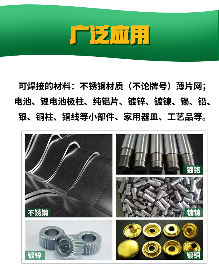 適用于不銹鋼、銅線與不銹鋼、鎳、銅、鐵等多種金屬的低溫(250℃)焊接。廣泛用于高品質要求的不銹鋼產品,鐘表儀器、醫療器件,精密部件及各類PCB板等方面的焊接
